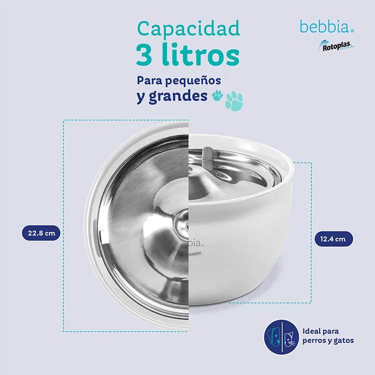 Cuida a tu mascota con agua purificada bebbia. La Fuente bebbia Pet + bebbia es la combinación ideal para el bienestar de perros y gatos, ayudando a cuidar sus riñones y digestión. Su funcionamiento silencioso y el movimiento constante mantienen el agua fresca, motivando a tu mascota a beber más. El Filtro de carbón activado protege el agua, atrapando pelos, polvo y malos sabores, además de ser libre de microplásticos. Con capacidad de 3 L, es fácil de armar y rellenar. Al usarla con el servicio de purificación bebbia, disfrutas de agua confiable sin cargar garrafones. ¡Beneficio Exclusivo para nuevos suscriptores! Obtén 30% de descuento en tus primeros 12 meses de suscripción al servicio bebbia. Válida tu cobertura bebbia en bebbia.com. Garantía: 3 meses contra defectos de fábrica.