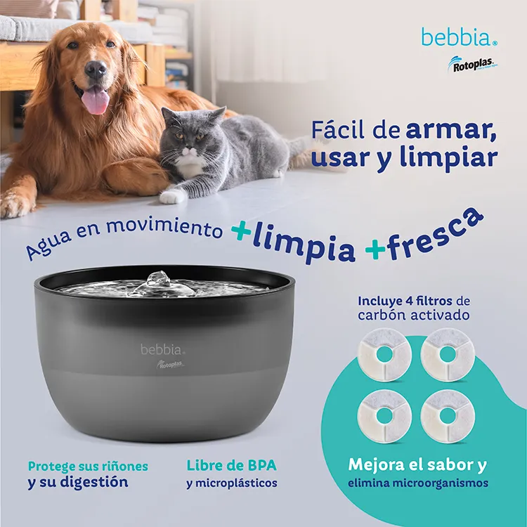 Cuida a tu mascota con agua purificada bebbia. La Fuente bebbia Pet + bebbia es la combinación ideal para el bienestar de perros y gatos, ayudando a cuidar sus riñones y digestión. Su funcionamiento silencioso y el movimiento constante mantienen el agua fresca, motivando a tu mascota a beber más. El Filtro de carbón activado protege el agua, atrapando pelos, polvo y malos sabores, además de ser libre de microplásticos. Con capacidad de 3 L, es fácil de armar y rellenar. Al usarla con el servicio de purificación bebbia, disfrutas de agua confiable sin cargar garrafones. ¡Beneficio Exclusivo para nuevos suscriptores! Obtén 30% de descuento en tus primeros 12 meses de suscripción al servicio bebbia. Válida tu cobertura bebbia en bebbia.com. Garantía: 3 meses contra defectos de fábrica.